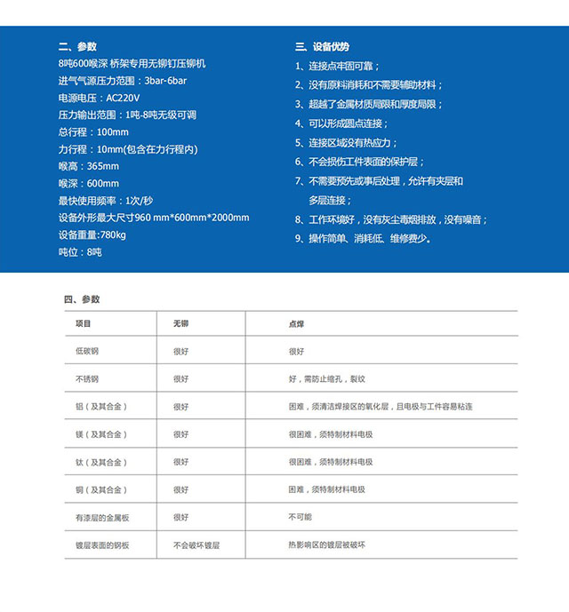 從無鉚釘鉚接機(jī)的出力來分,可以分為5噸壓力無鉚釘鉚接機(jī),8噸壓力無鉚釘鉚接機(jī),10噸壓力無鉚釘鉚接機(jī),15噸無鉚釘鉚接機(jī),20噸無鉚釘鉚接機(jī),30噸無鉚釘鉚接機(jī),40噸無鉚釘鉚接機(jī),50噸無鉚釘鉚接機(jī),80噸無鉚釘鉚接機(jī),100噸無鉚釘鉚接機(jī)......